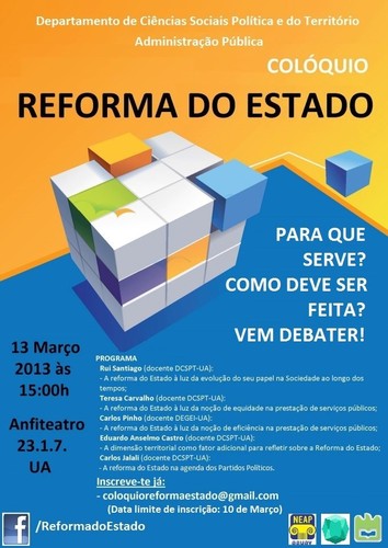 Por entendermos que esta é uma oportunidade para envolver a comunidade neste debate, vimos por este meio convidá-lo a estar presente no colóquio que vamos organizar no dia 13 de Março pelas 15h. A confirmação da inscrição poderá ser feita coloquioreformaestado@gmail.com ou através do LINK.
